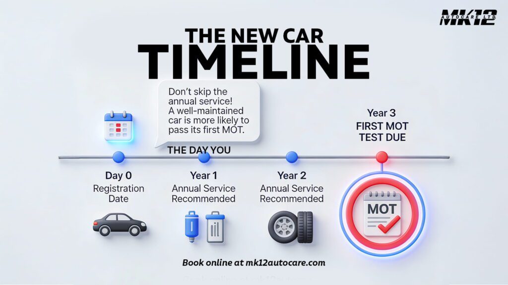 There’s something special about driving a brand new car off the forecourt. Everything works perfectly, that new car smell lingers for weeks, and you’ve got the peace of mind knowing you’re the first person to turn the key. But here’s a question many new car owners in Milton Keynes ask us at MK12 Autocare: when does my shiny new motor actually need its first MOT?