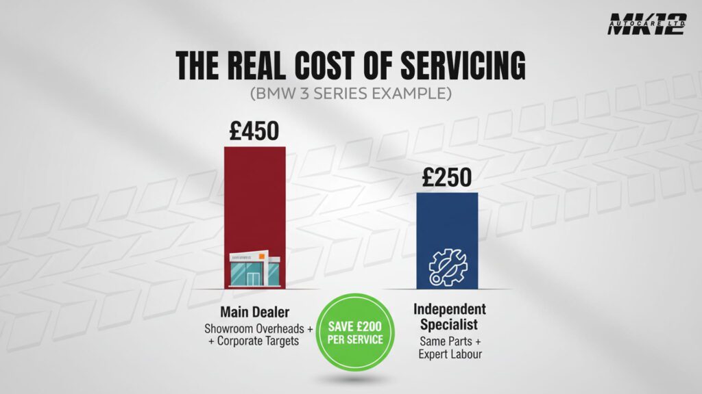 Alright, cards on the table – main dealers are properly expensive. We’re not talking a bit pricey, we’re talking take-your-breath-away expensive. Labour rates are pushing £150 an hour in some places. Parts that cost double what you’d pay anywhere else. Service plans that feel like they’re designed to fund someone’s yacht.